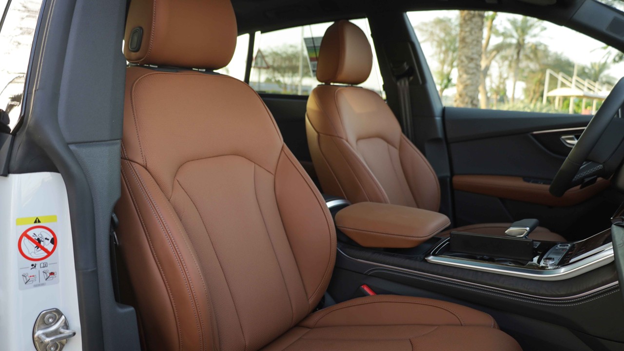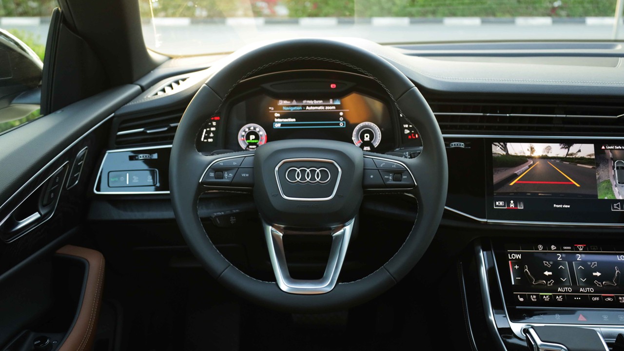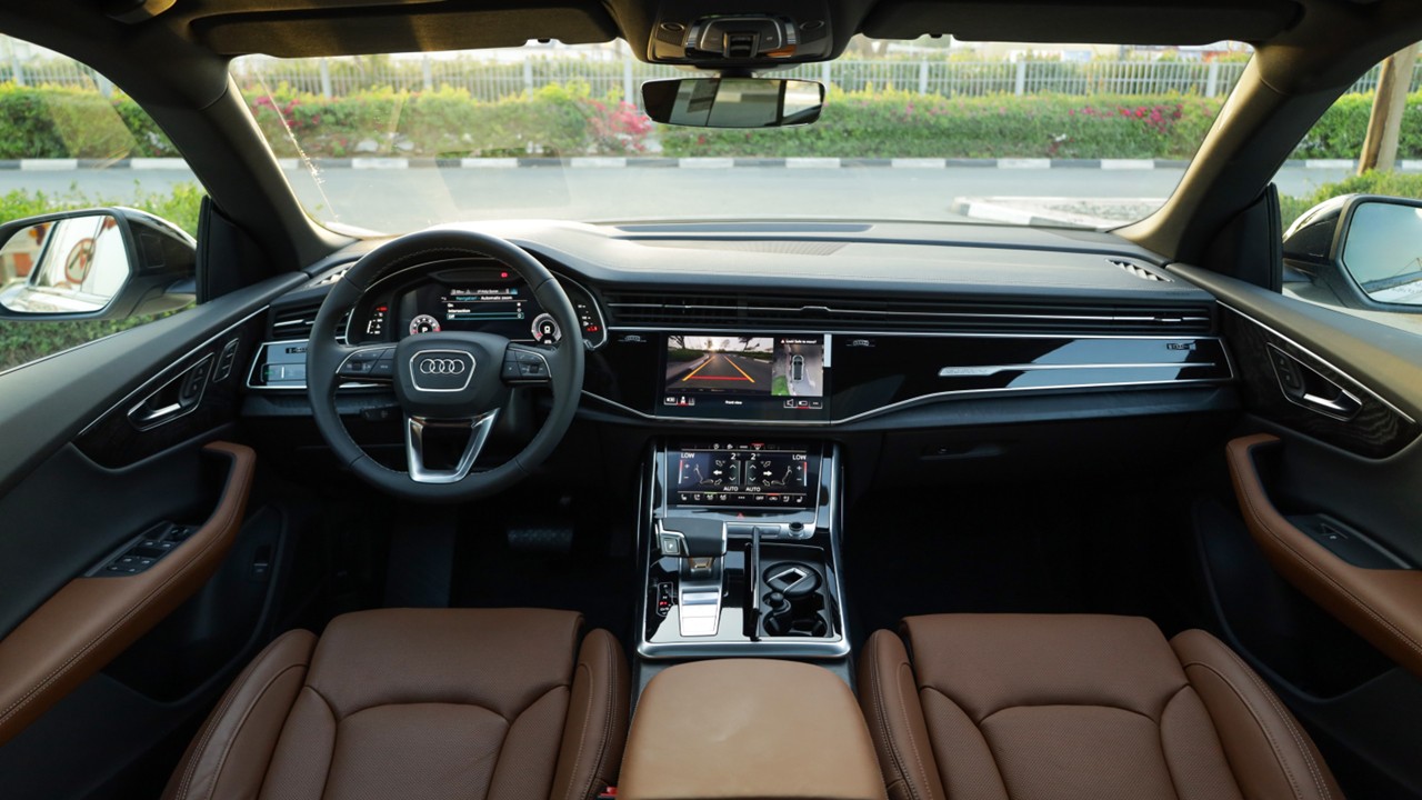 سيارة Audi Q8 مزودة بنظام تعليق هوائي متكيف قابل للتعديل حسب وضعية القيادة (Comfort – Dynamic – Offroad)، مما يوفر استجابة ناعمة وراحة عند المرور على المطبات أو تقلبات الطريق